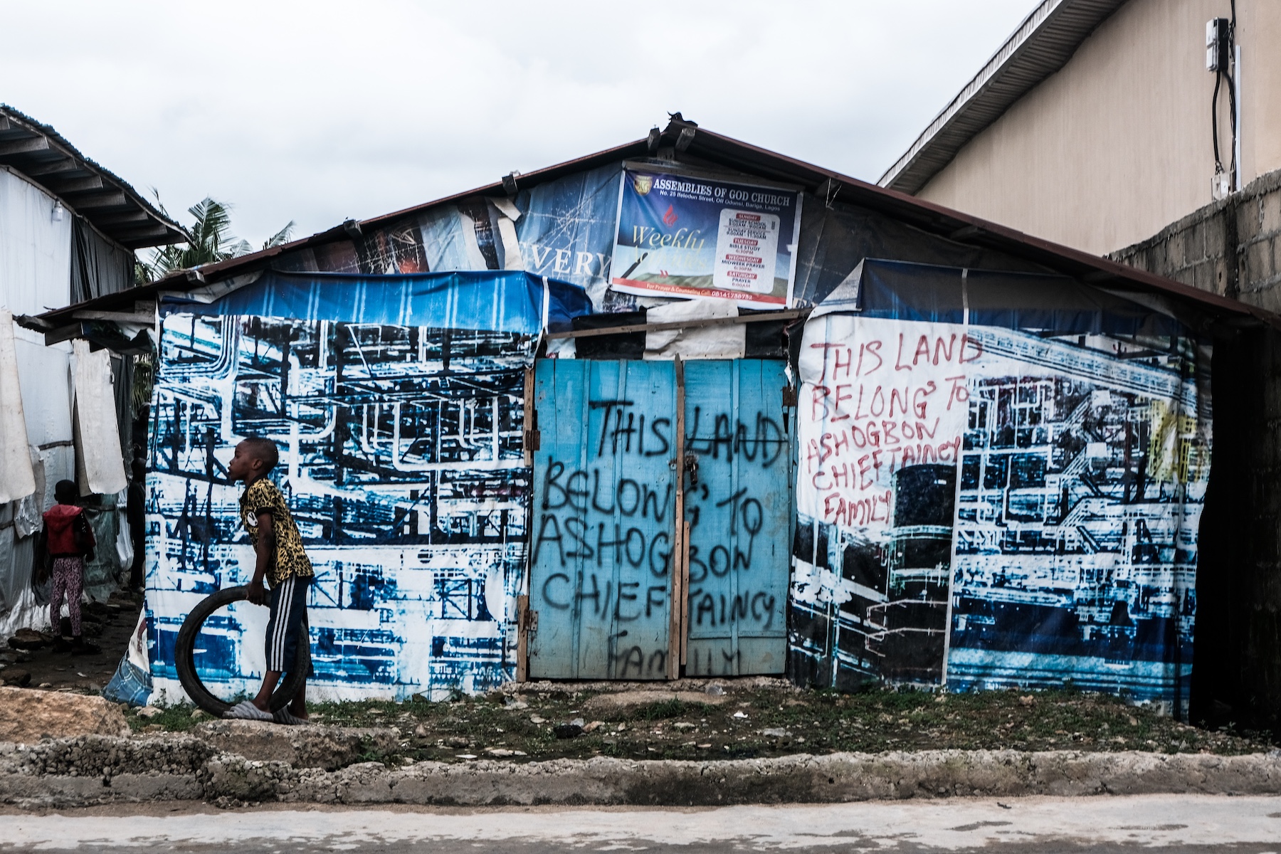 Bankole Damilola documentary photography and installation dey complement Ozegbe material testimony. Damilola na resident of Oworonshoki during the demolition. Him project This Land Is Not for Sale join strong documentary images with roofing sheets wey dem write messages like "Beware of 419" and "This House Is Not for Sale." The photographs show the raw human pain of displacement, especially how e affect women and children. The written zinc sheets show how communities dey create their own systems of resistance to claim ownership and belonging. Damilola work show say belonging no dey come from government paper or company contract, but from lived history, ancestral roots, and community bond.