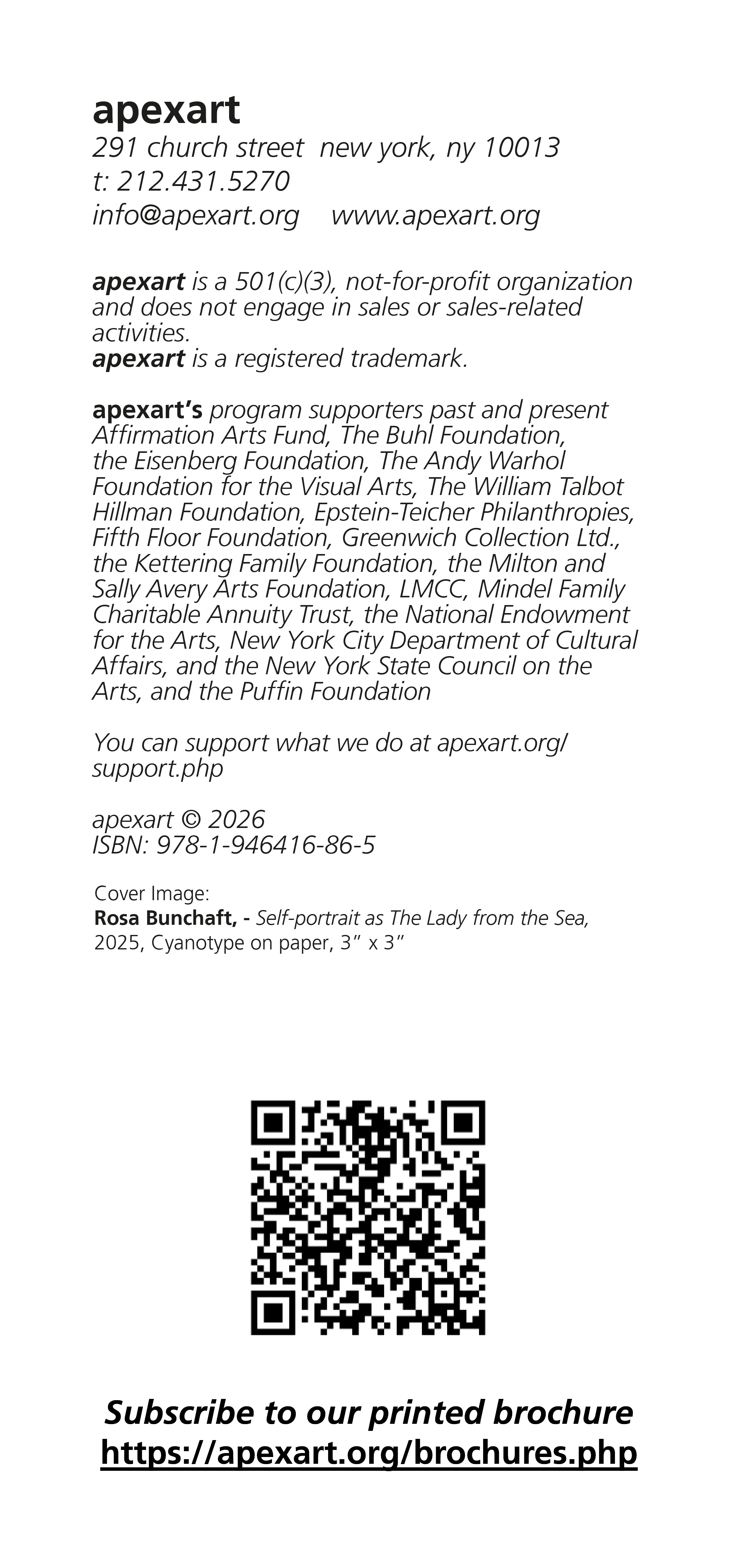 apexart’s program supporters past and present include the National Endowment for the Arts, Milton and Sally Avery Arts Foundation, the Kettering Family Foundation, the Buhl Foundation, The Martin and Rebecca Eisenberg Foundation, Bloomberg Philanthropies, Spencer Brownstone, the Kenneth A. Cowin Foundation, Epstein Teicher Philanthropies, The Greenwich Collection Ltd., William Talbott Hillman Foundation/Affirmation Arts Fund, the Fifth Floor Foundation, The Puffin Foundation, the Trust for Mutual Understanding, The Andy Warhol Foundation for the Visual Arts, and public funds from the New York City Department of Cultural Affairs in partnership with the City Council, public funds from Creative Engagement, supported by the New York State Council on the Arts with the support of the Governor and administered by LMCC, funds from NYSCA Electronic Media/Film in Partnership with Wave Farm: Media Arts Assistance Fund, with the support of the Office of the Governor and the New York State Legislature, as well as the New York State Council on the Arts with the support of Governor Kathy Hochul and the New York State Legislature.