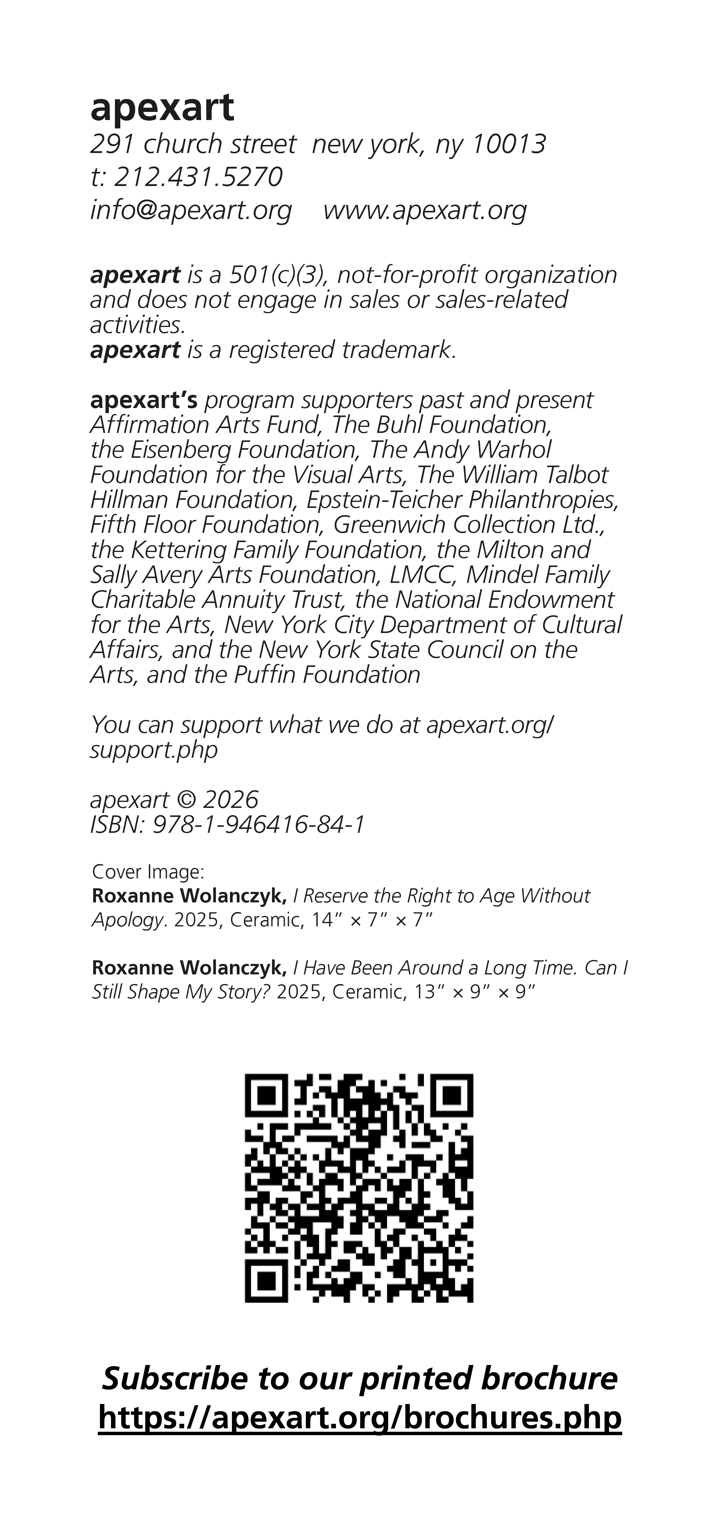 apexart’s program supporters past and present include the National Endowment for the Arts, Milton and Sally Avery Arts Foundation, the Kettering Family Foundation, the Buhl Foundation, The Martin and Rebecca Eisenberg Foundation, Bloomberg Philanthropies, Spencer Brownstone, the Kenneth A. Cowin Foundation, Epstein Teicher Philanthropies, The Greenwich Collection Ltd., William Talbott Hillman Foundation/Affirmation Arts Fund, the Fifth Floor Foundation, The Puffin Foundation, the Trust for Mutual Understanding, The Andy Warhol Foundation for the Visual Arts, and public funds from the New York City Department of Cultural Affairs in partnership with the City Council, public funds from Creative Engagement, supported by the New York State Council on the Arts with the support of the Governor and administered by LMCC, funds from NYSCA Electronic Media/Film in Partnership with Wave Farm: Media Arts Assistance Fund, with the support of the Office of the Governor and the New York State Legislature, as well as the New York State Council on the Arts with the support of Governor Kathy Hochul and the New York State Legislature.