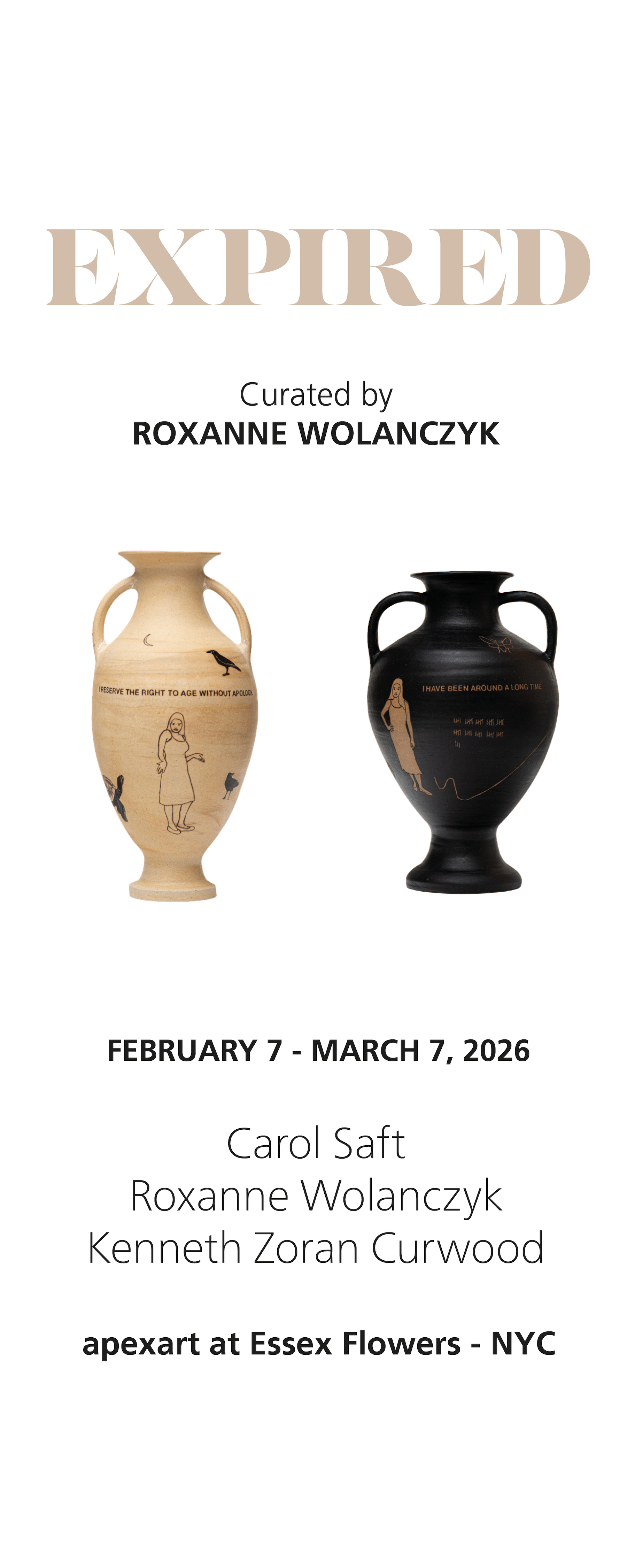 This exhibition explores the intersections of aging, loss of relevance, and the inevitability of death in a society that often views aging as a process of becoming expired. In Gen Z slang, expired refers to someone past their prime or out of touch with current trends—a playful way to describe irrelevance. However, expired is also a clinical euphemism for death, framing this exhibition’s exploration of aging as both a societal and personal journey. By critically examining how aging is treated in culture, the exhibition reveals the tension between perceptions of decline and the possibilities of transformation as individuals confront the aging process and mortality.