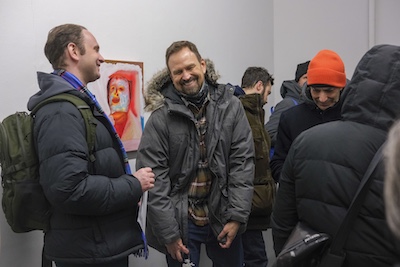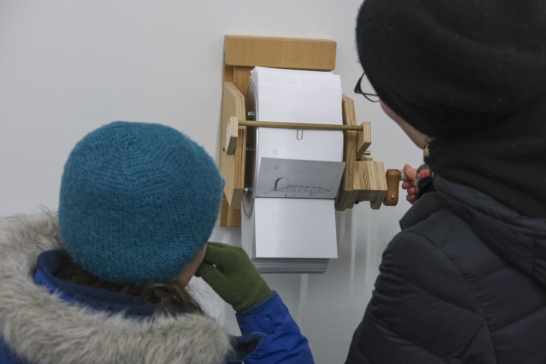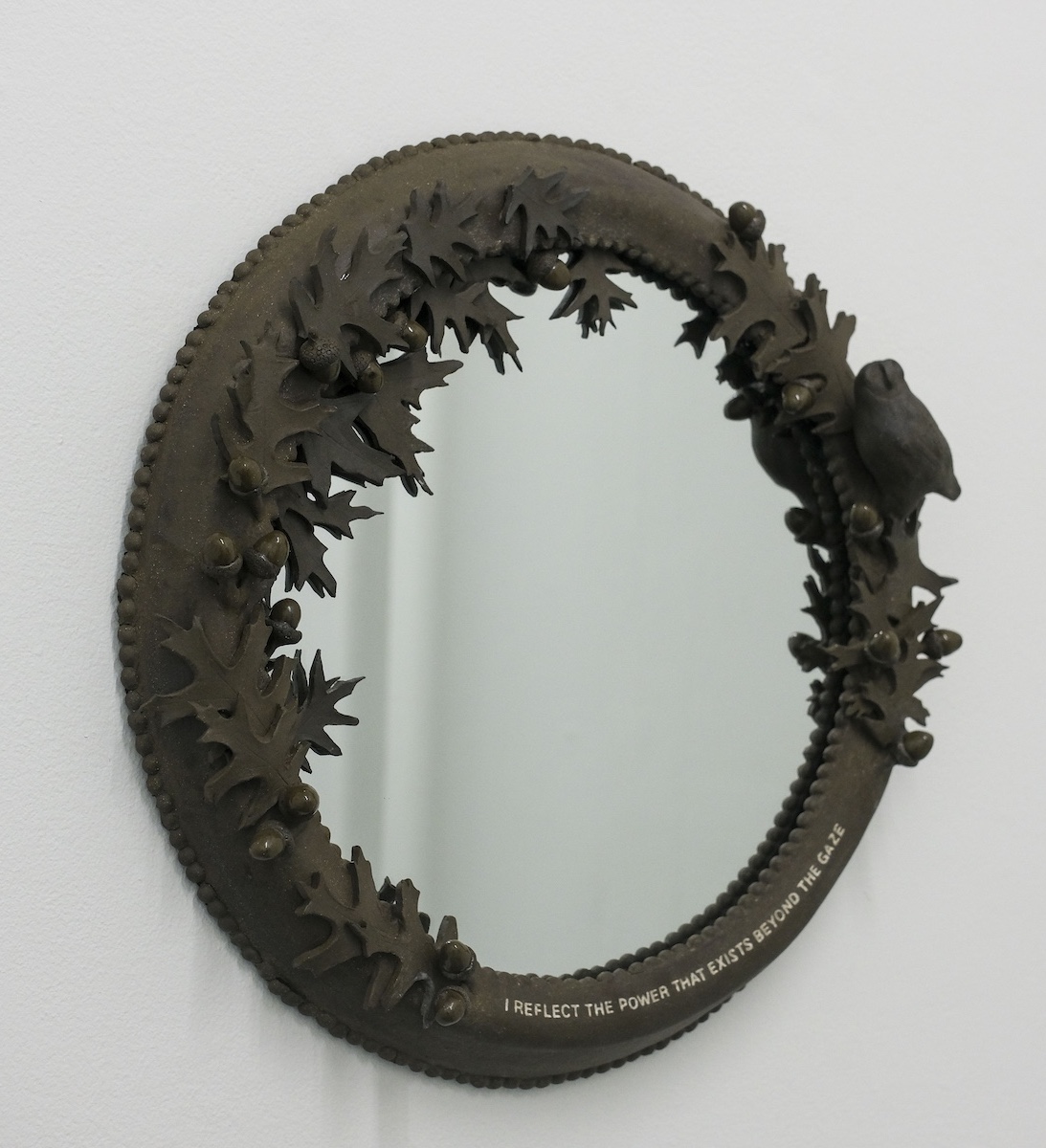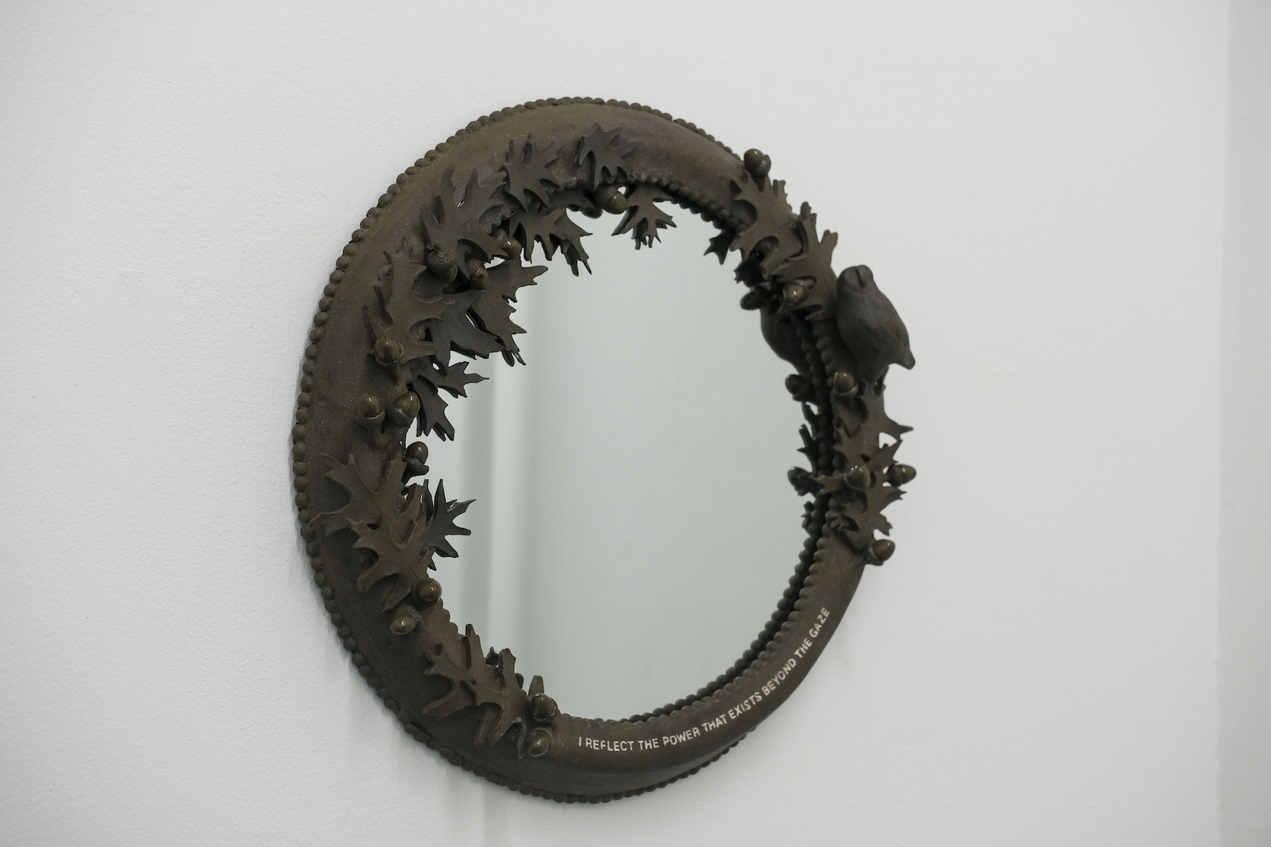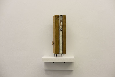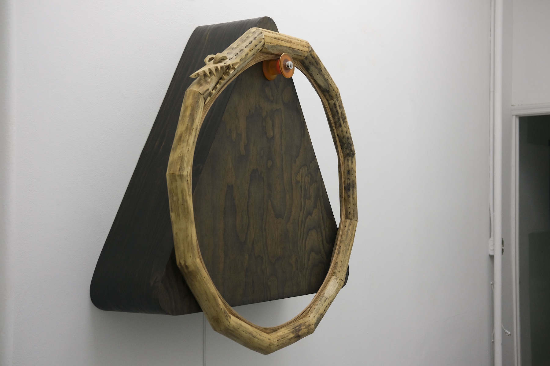 K.C. is a multimedia artist based in New York City. His piece, “Sans Soleil,” is an intricate, large found leaf mounted on brass, its appearance evolving with time as it ages. His animation, “Marginalia,” in the style of early 20th-century cartoons, is filled with symbols of death, transformation, and rebirth in a beautifully choreographed loop. In “Alexa…When are the men coming to take me from my home?”—a wood and soldered glass analog sculpture referencing the Amazon Echo—K.C., who is not a digital native, playfully critiques ever-advancing technology in contemporary society, which reflects the dissonance between older generations and their relationship to rapidly evolving tech.