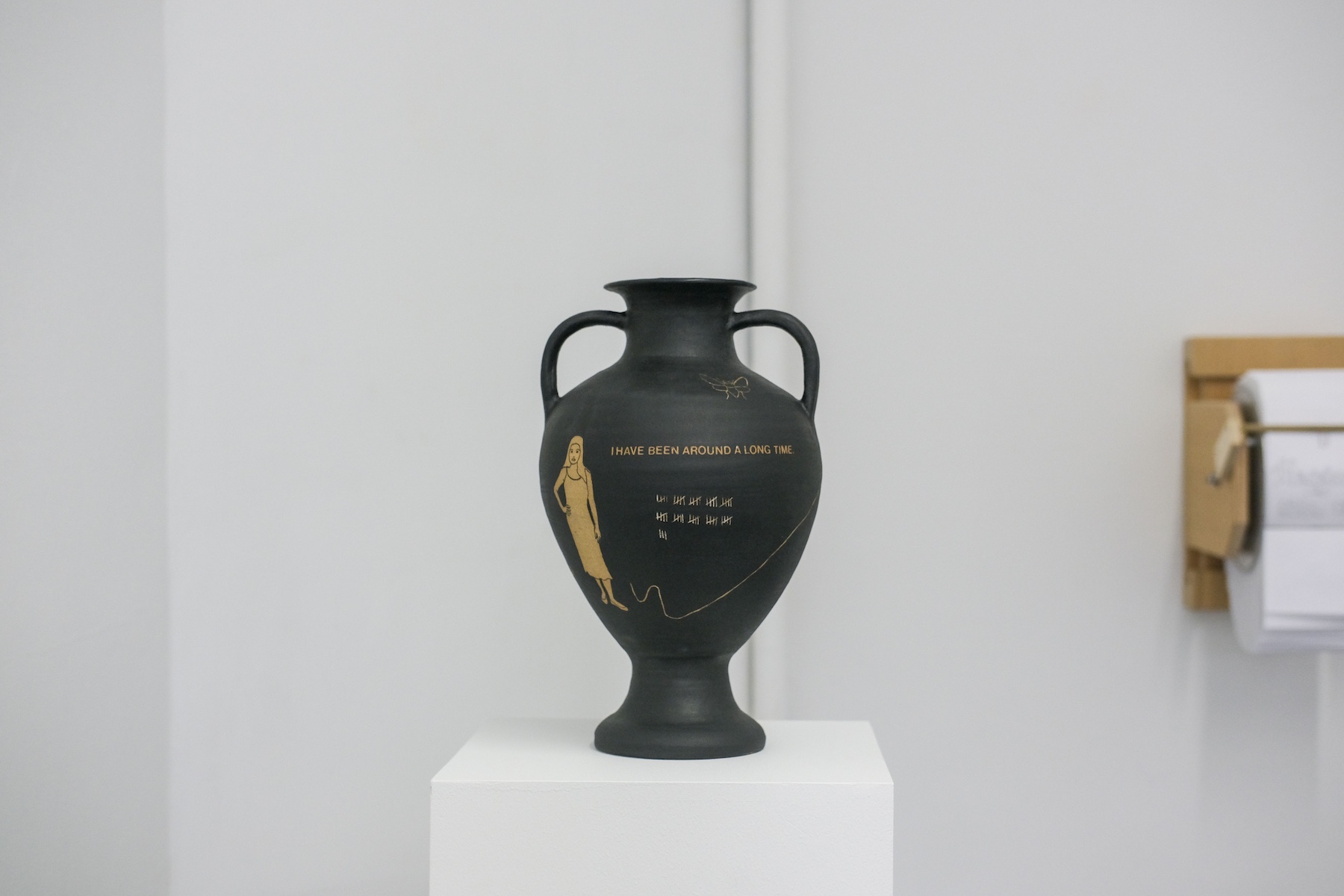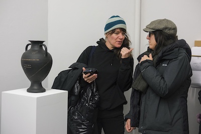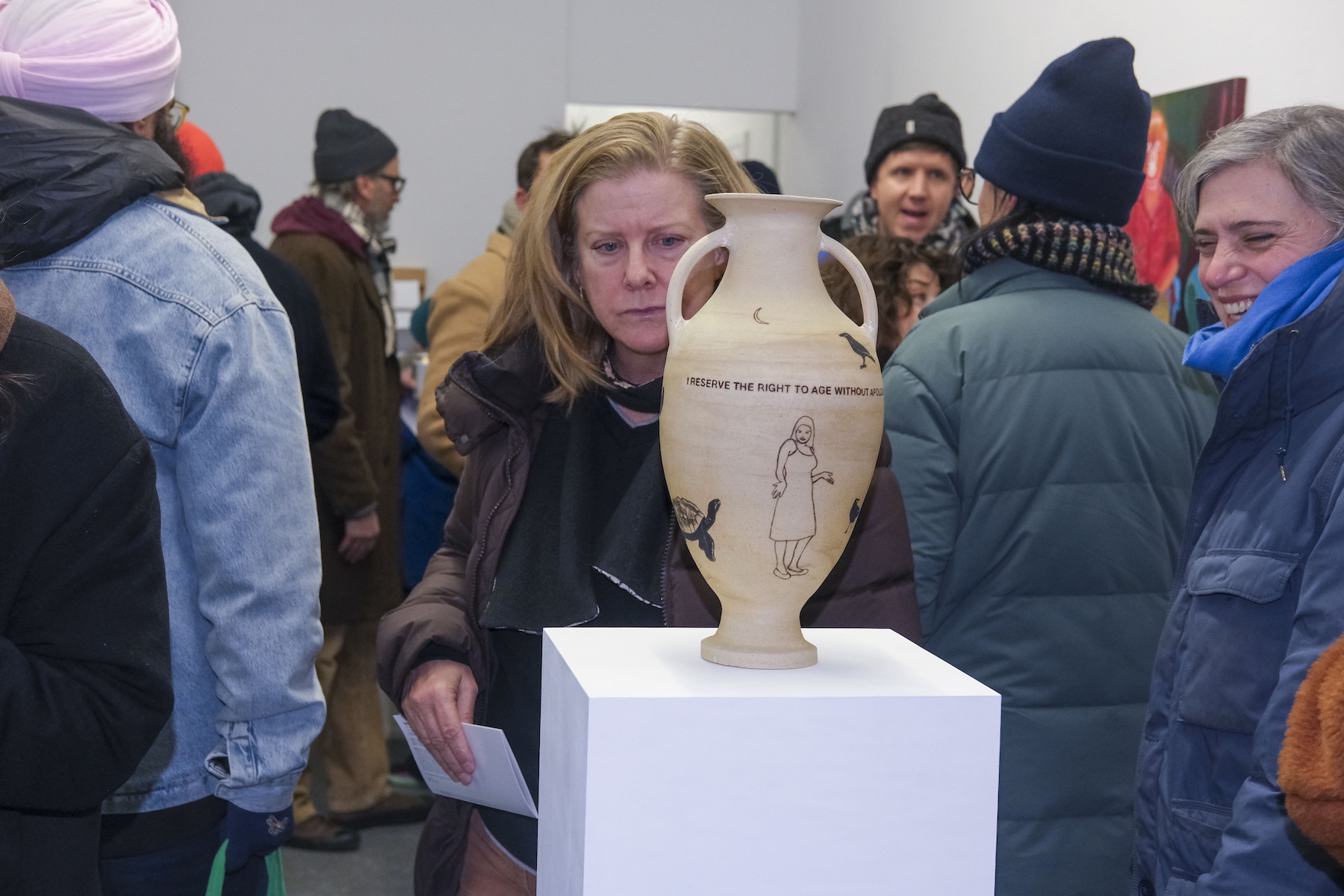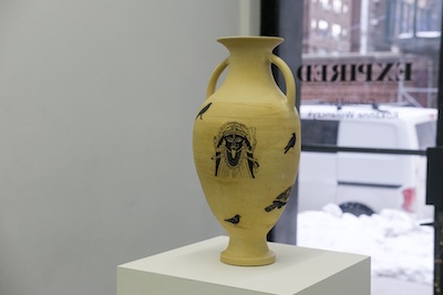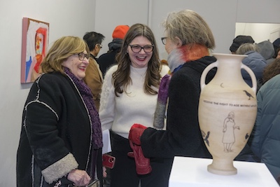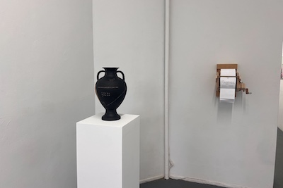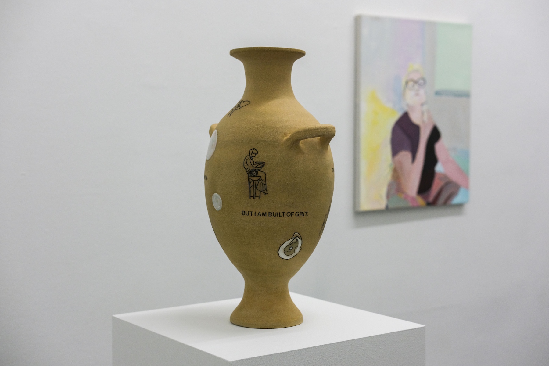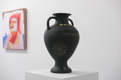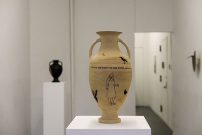 R.W. is a ceramic artist based in New York City who spent years working as a geriatric social worker, providing support for an often overlooked population. Her classical urns and vessels, adorned with text and symbols of transformation, death, and regeneration, confront existential questions of mortality. Her piece, “I will soon be an antiquity. I hope to handle the passage of time intact. I am developing an interesting patina,” reflects on aging as a process of becoming both vulnerable and resilient. Another work, “I feel lost. Will I be found? Will I remain in one piece?” speaks to both the body of the artist, the vase itself, and the context they both exist.